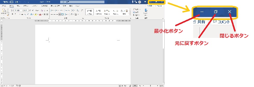 元に戻すボタンとは、最大化している画面を縮小する(元の大きさに戻す)ボタンです。画面が縮小されている状態では、最大化ボタンに変わります。