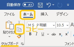 コピーしたい箇所を選択してから、「ホーム」ー「クリップボード」の「コピー」ボタンをクリックします。コピーをクリックしただけではコピーがされませんが、貼り付けたいところをクリックして「貼り付け」をすると、文字がコピーされます。貼り付けに関しては下記の「3.貼り付け」で説明します。