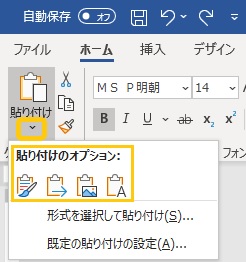 貼り付ける時に「貼り付け」ボタンの下向き矢印をクリックすると、貼り付けのオプションが現れます。