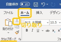 切り取りしたい箇所を選択してから、「ホーム」ー「クリップボード」の「切り取り」ボタンをクリックします。「切り取り」を行うと、元の文字が非表示になります。