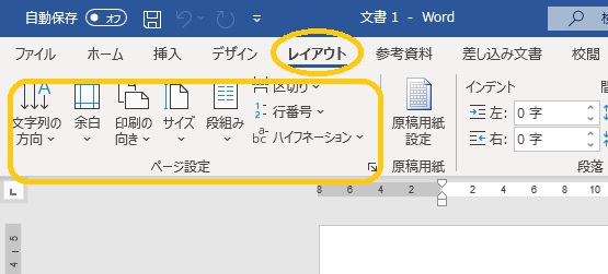 メニューバーから「レイアウト」を選択すると、ページ設定の欄から変えたいものを選択できます。