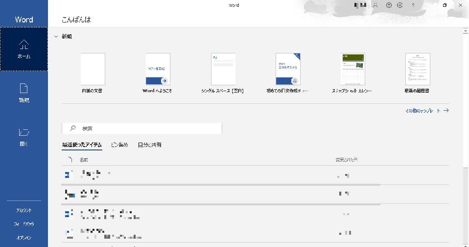 Wordを起動すると、最初に開くのが次のようなページです。
