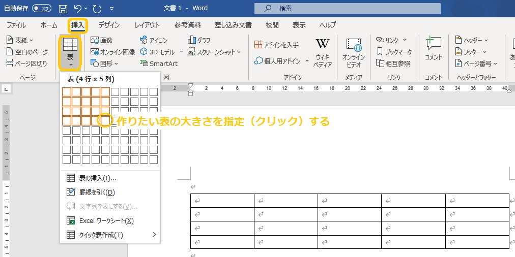 マス目が現れるので、作りたい表の大きさを指定(クリック)すると、表が挿入できます。