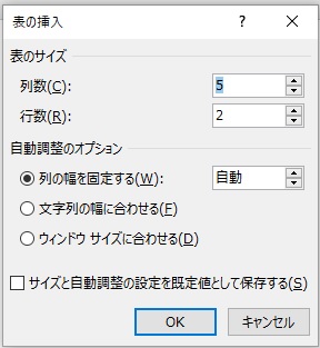 「表の挿入」画面が出てくるので、作りたい表の列数と行数を指定します。最後に「OK」をクリックします。