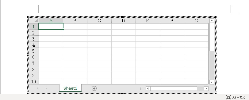 Excelワークシートが挿入されます。周りの線をドラッグすると大きさも変えられます。