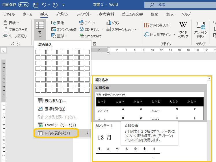 「挿入」ー「表」の「表」ボタンをクリックした後、「クイック表作成」をクリックします。