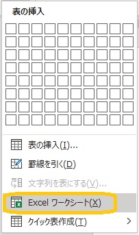 「挿入」ー「表」の「表」ボタンをクリックした後、「Excelワークシート」をクリックします。