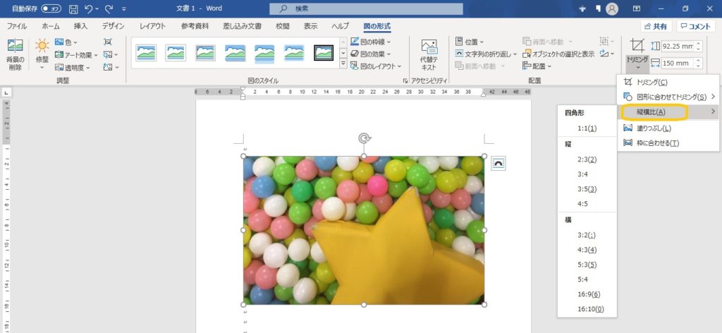 図をクリックします。「図の形式」ー「サイズ」から「トリミング」ボタンをクリックし、「縦横比」を選択します。