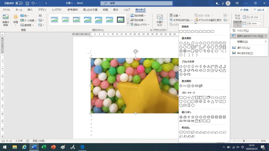 図をクリックして、「図の形式」ー「形」で「トリミング」ボタンをクリックし、「図形に合わせてトリミング」を選択します。