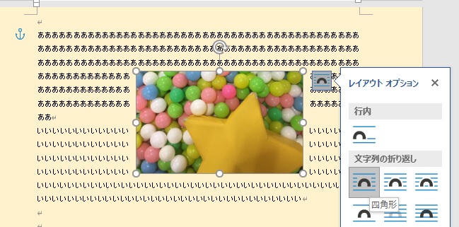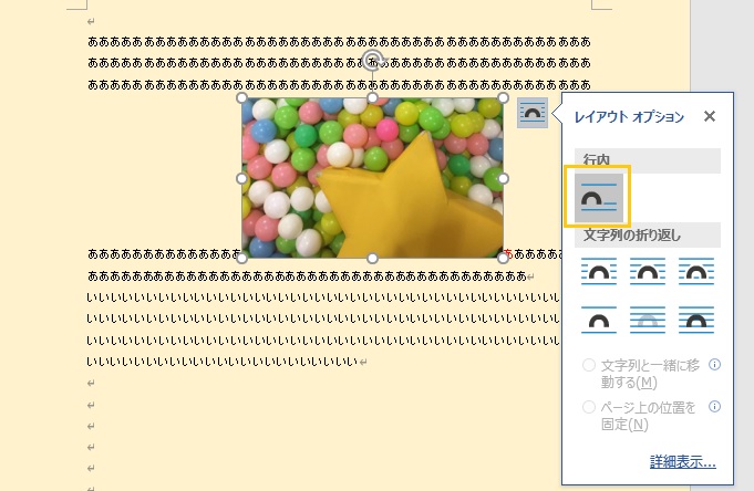 図(写真など)を文書に挿入すると、デフォルトで「行内」という文字列の折り返しの設定になります。
